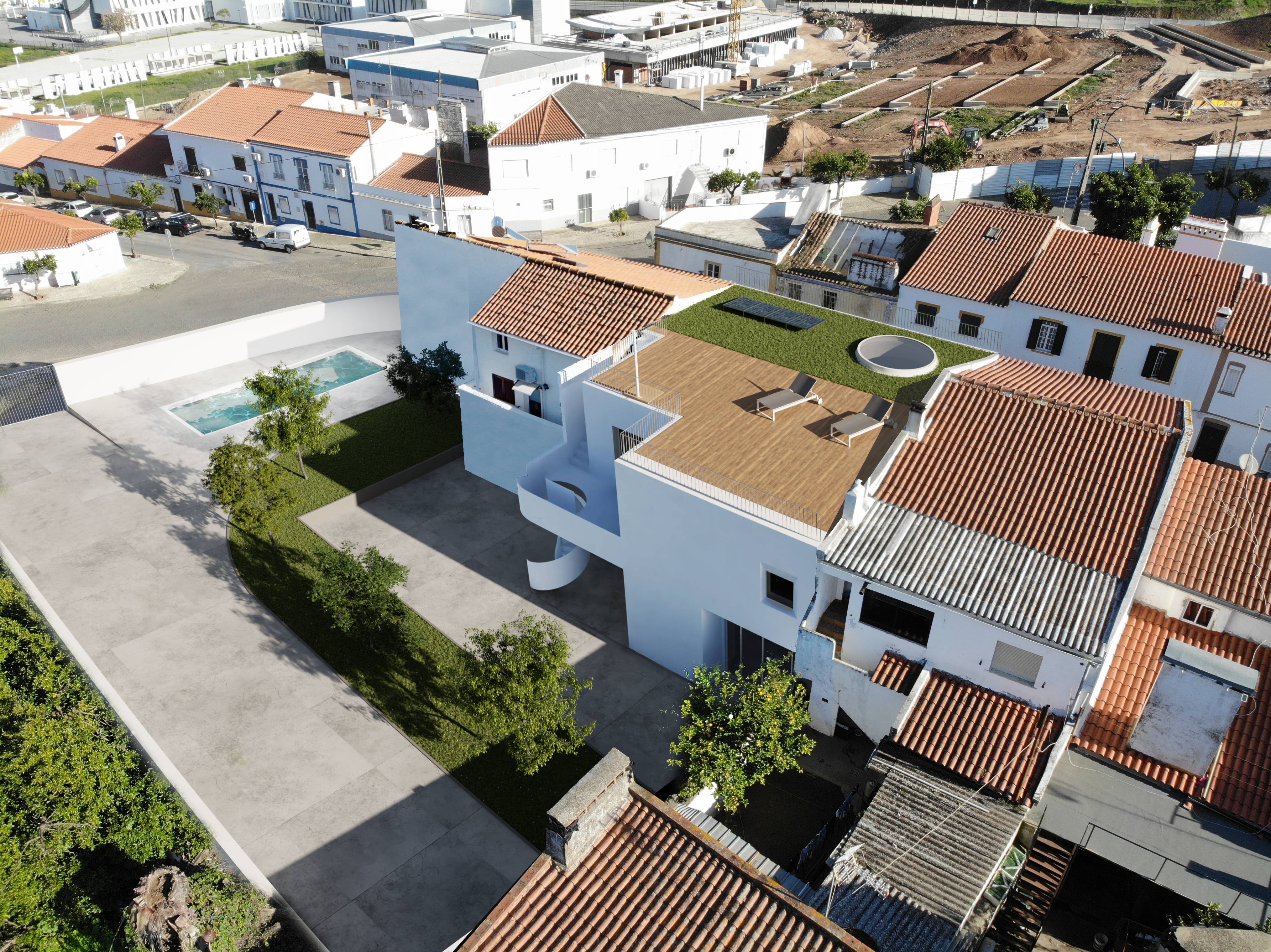 O protagonismo construtivo da intervenção apoia-se na forma depurada em prol de uma mera reconversão do edifício existente. A neutralidade cromática e cobertura em terraço ajuda a relembrar a herança islâmica, fortemente presente no Alentejo, levando a um nível de intimidade vivencial adequada ao contexto urbano e regional.
